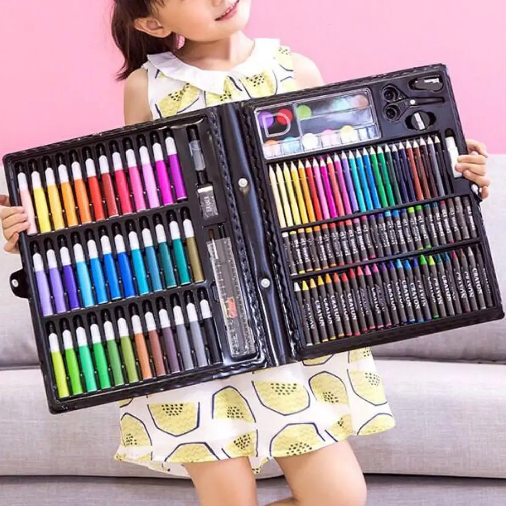 Valija set artistico 150 pcs36 marcadores -24 cryones de cera24 pasteles -24 lapices -20 clips12 acuarelas -1 pincel -1 paleta -1 abrochadora -1 tijera -1 esponja -1 sacapuntas1 pegamento -1 regla -goma de borrar -1 lapiz -1 estuche con manija